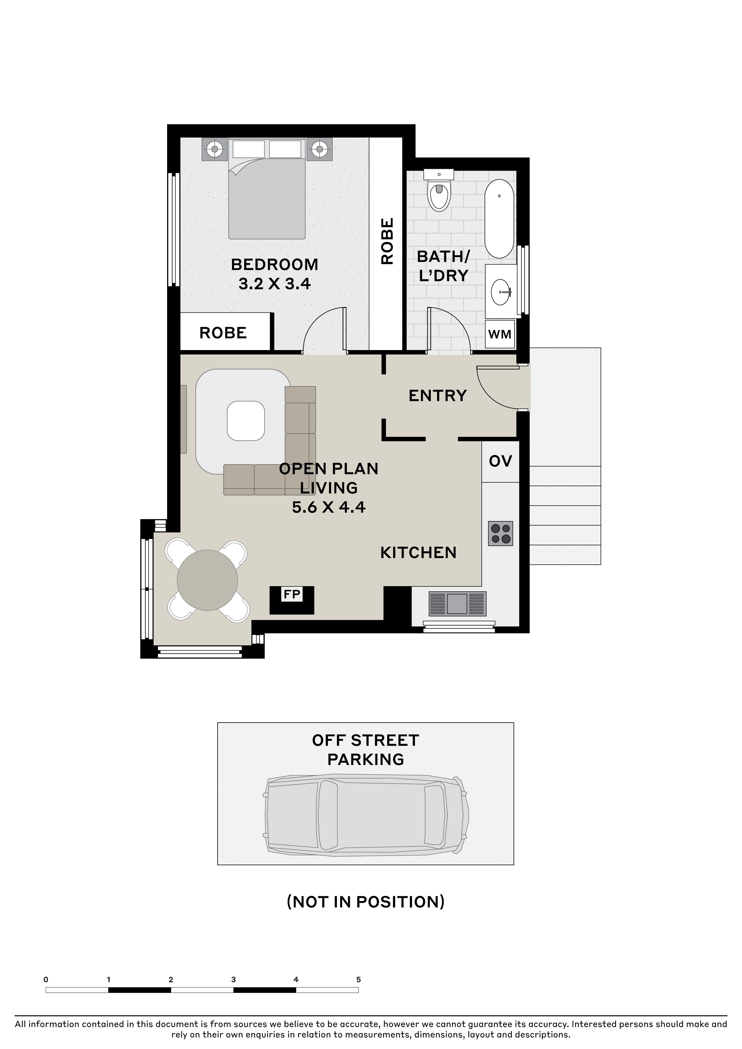 Built in 1995, the property offers a practical open-plan kitchen and living area, a layout that consistently appeals to tenants and supports reliable rental demand. The spacious bedroom includes a built-in wardrobe, maximising storage and functionality, while the combined bathroom/laundry is efficiently designed with a shower-bath, vanity, toilet, and allocated laundry space.